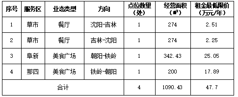 2.2招商范圍及合同包:本次招商項目將草市服務區雙側餐廳2個、阜新服務區(朝陽-鐵嶺方向)美食廣場1個、那四服務區(鐵嶺—朝陽方向)美食廣場1個,共計4個經營點位劃分為1個合同包。